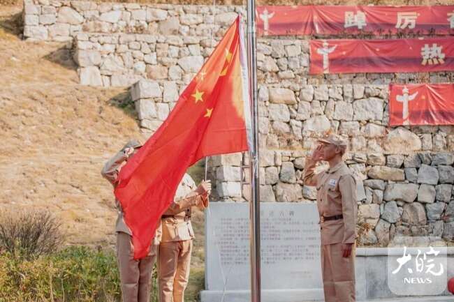 升旗仪式上,抗美援朝老兵面对“保家卫国 中国人民志愿军抗美援朝72周年”大型画板心情激动,现场重温了他们在战场上殊死战斗的不凡经历和感人故事。
